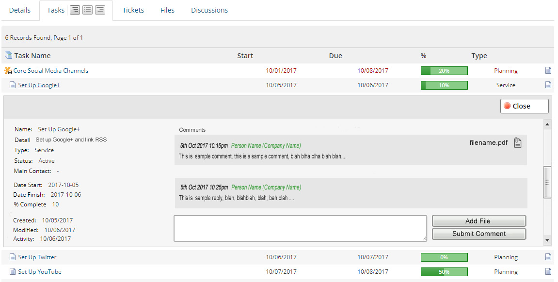 | Description | File attachments and comments should be available in the clients control panel for each individual action (not as it is currently at the project level). Suggest making better use of the expandable area for each action to include: 1) View comments history for the action (admin and client) in expandable area with date and time, user info. 2) Add a textarea in the action expandable area to quick add a new comment with optional attachment. Add the above features and I think you've hot sweet spot! Comments and file attachements should be on a per action basis for the client otherwise its very confusing. A single project could have a lot of actions within it. | ||||||||||||